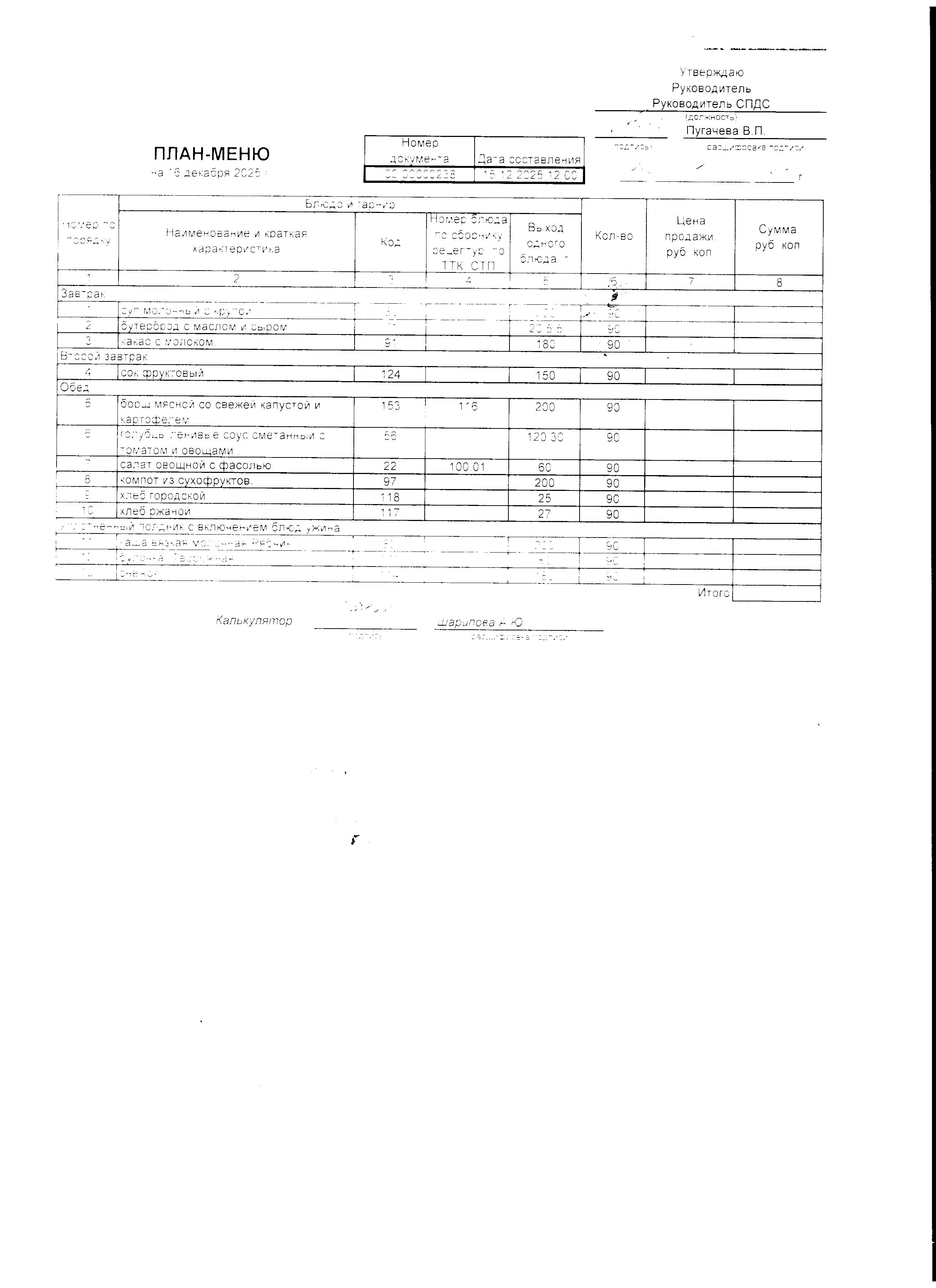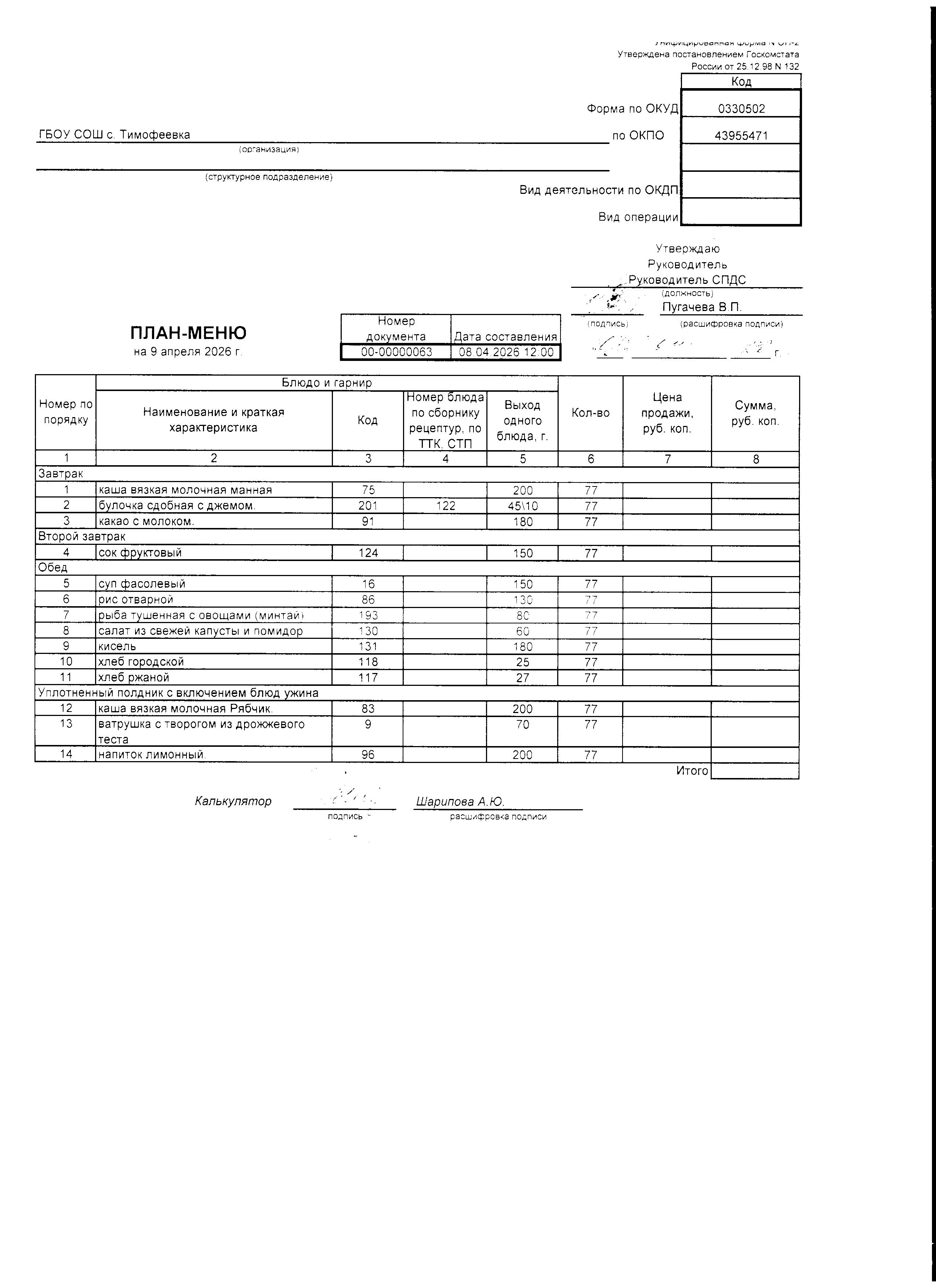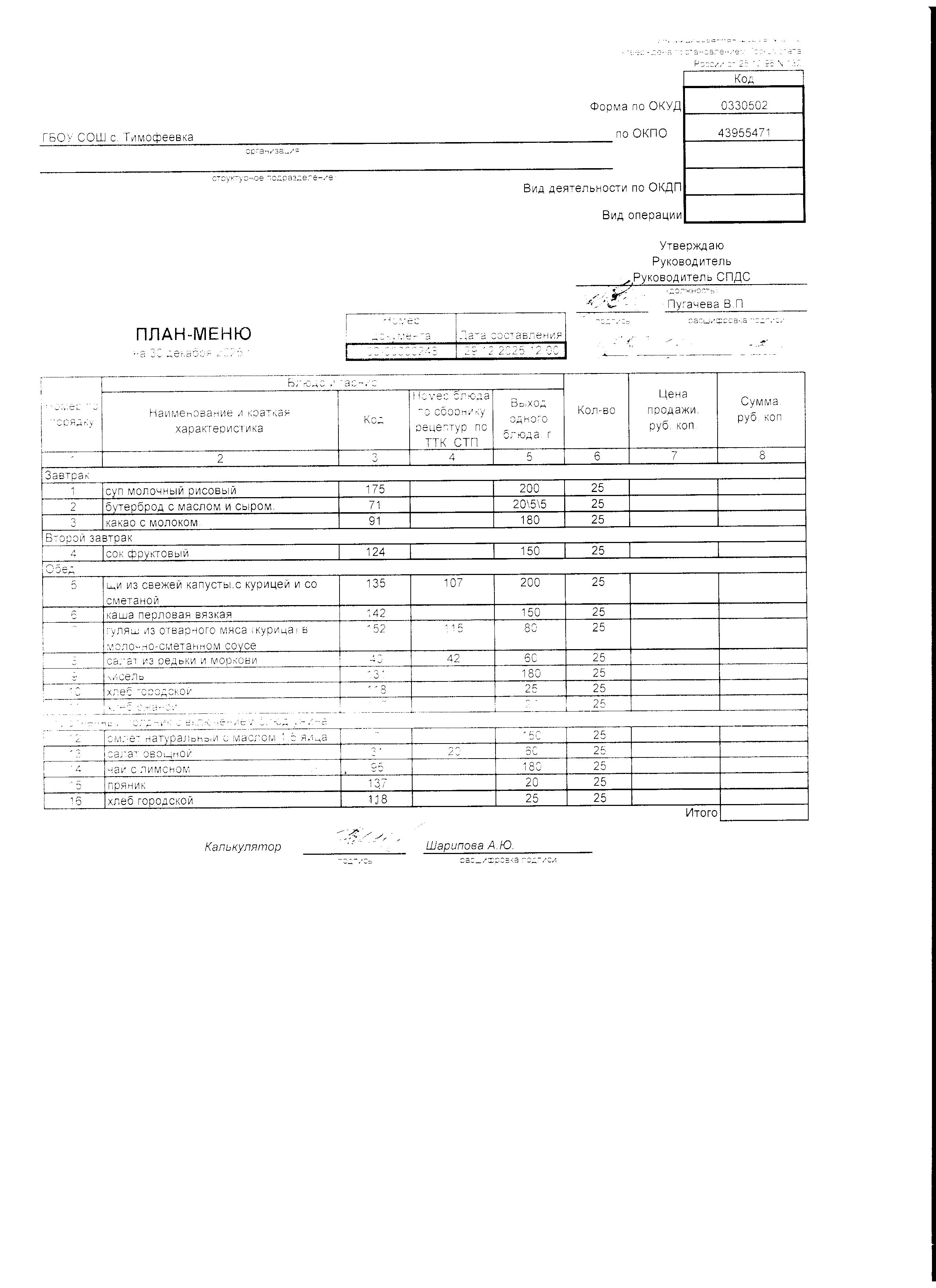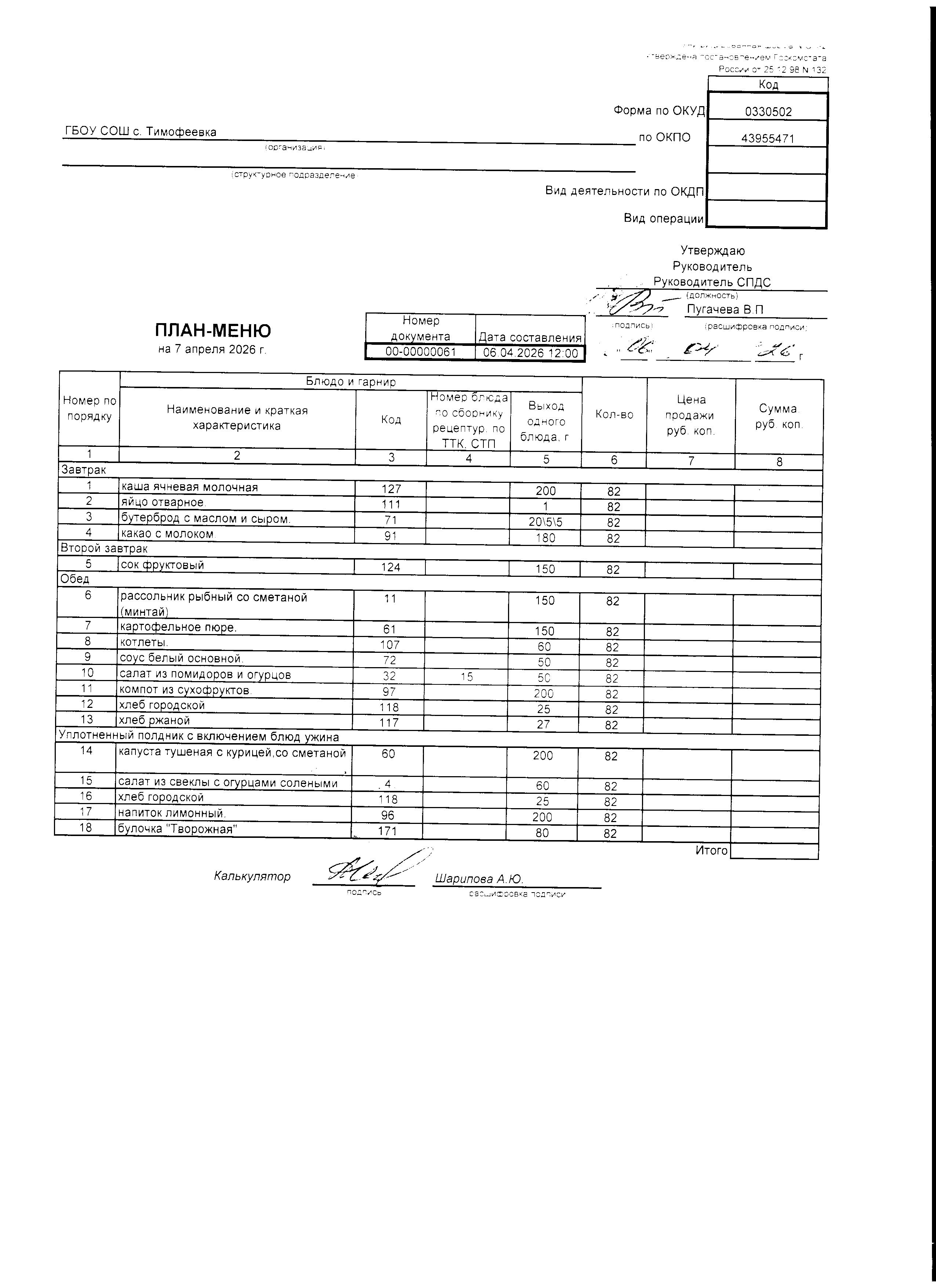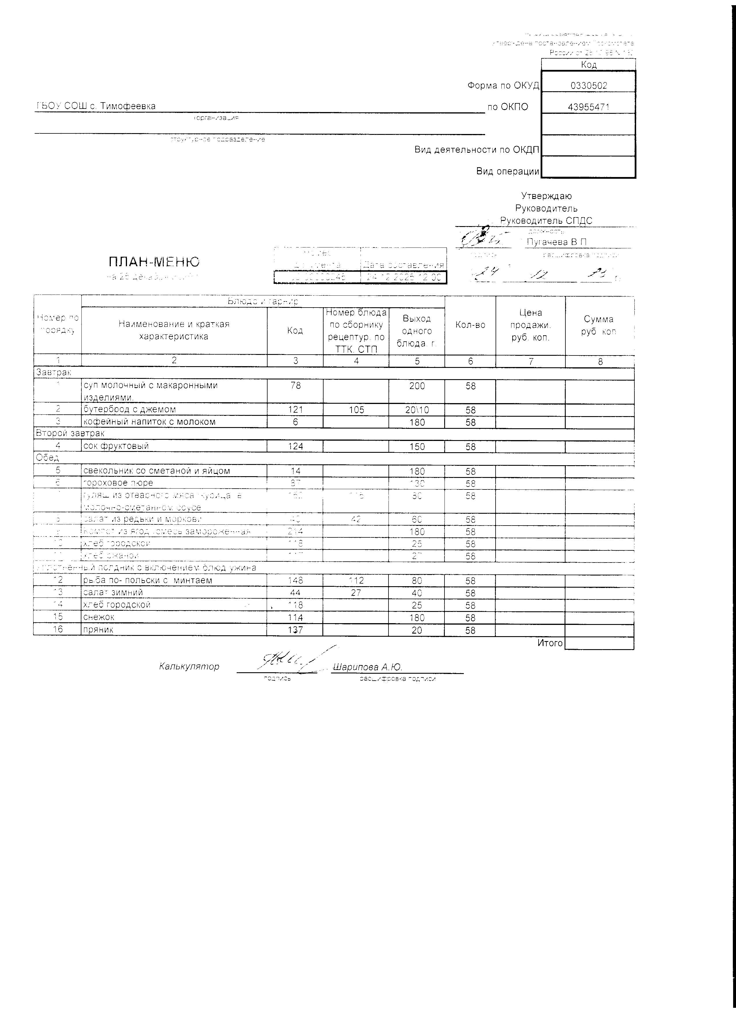 Утвержденное примерное меню (по сезонам в соответствии с возрастной категорией обучающихся)
