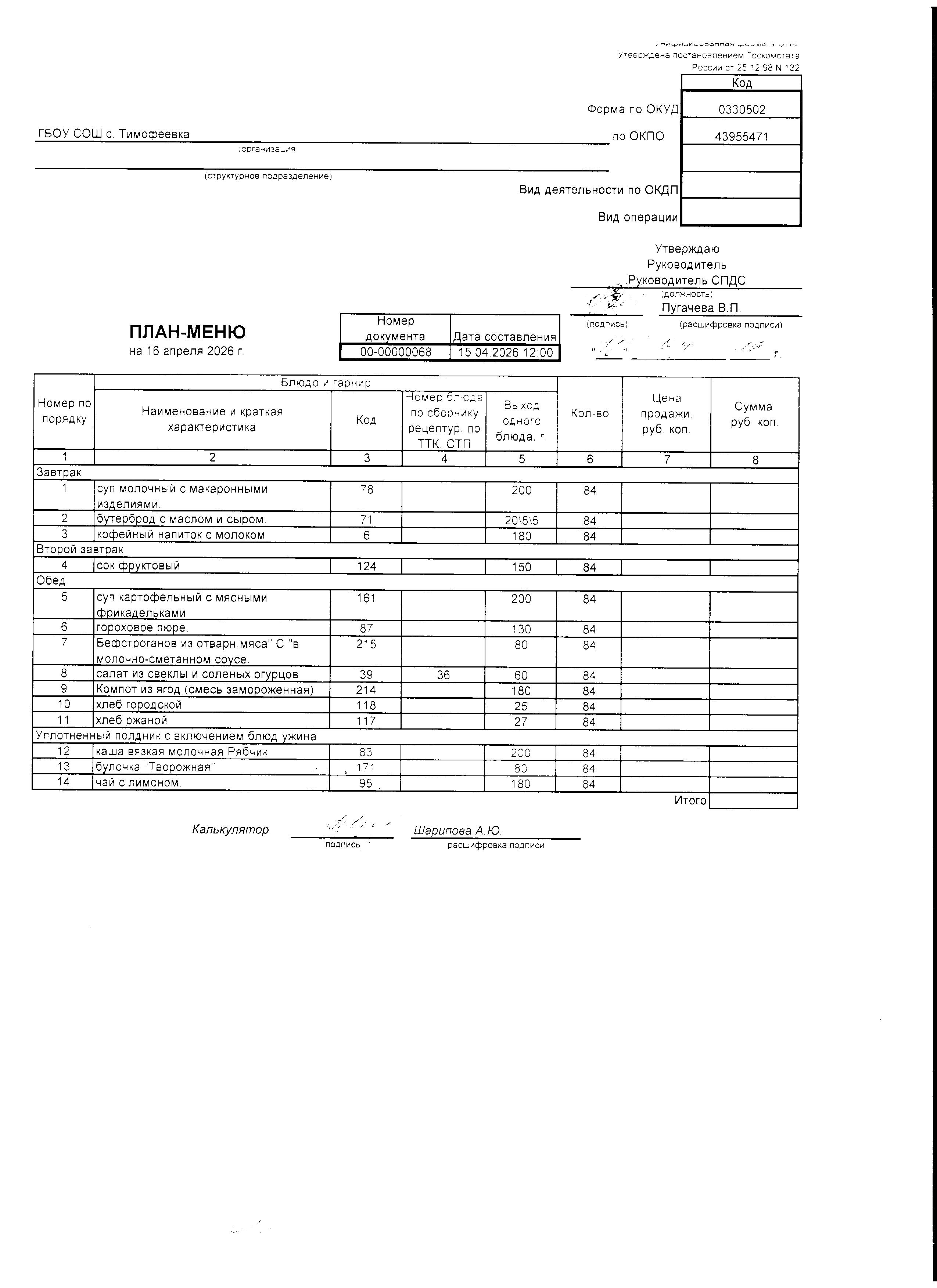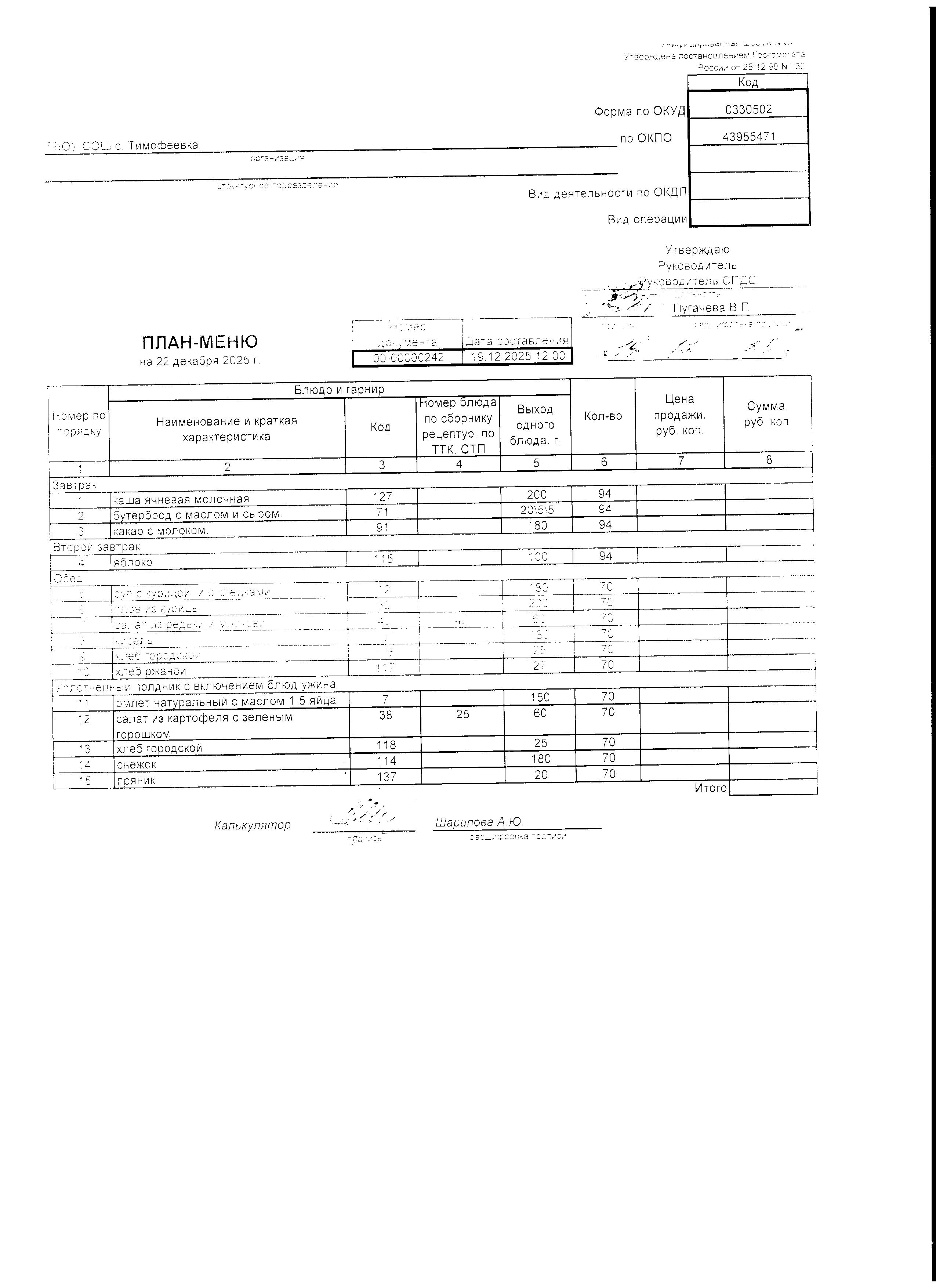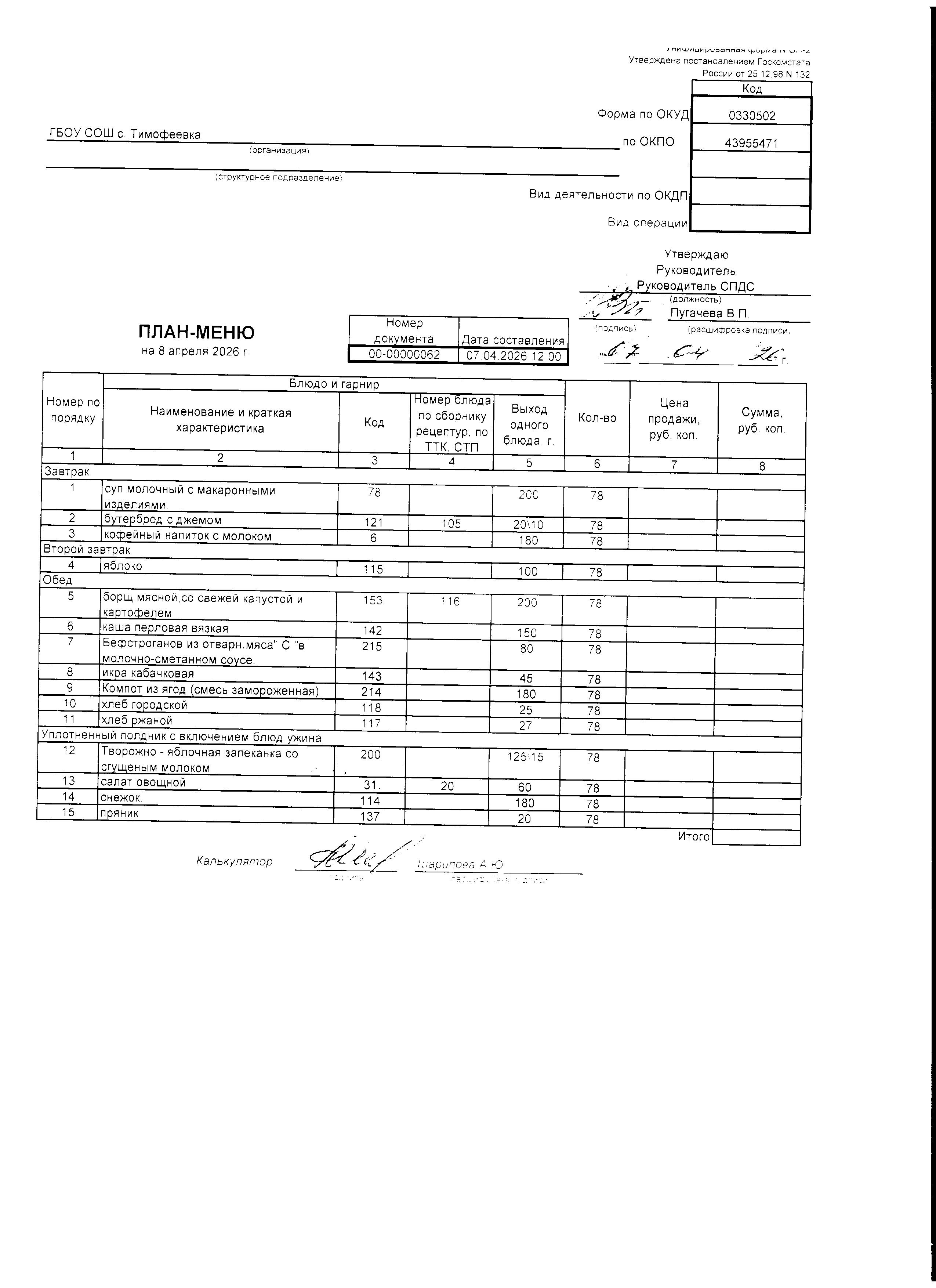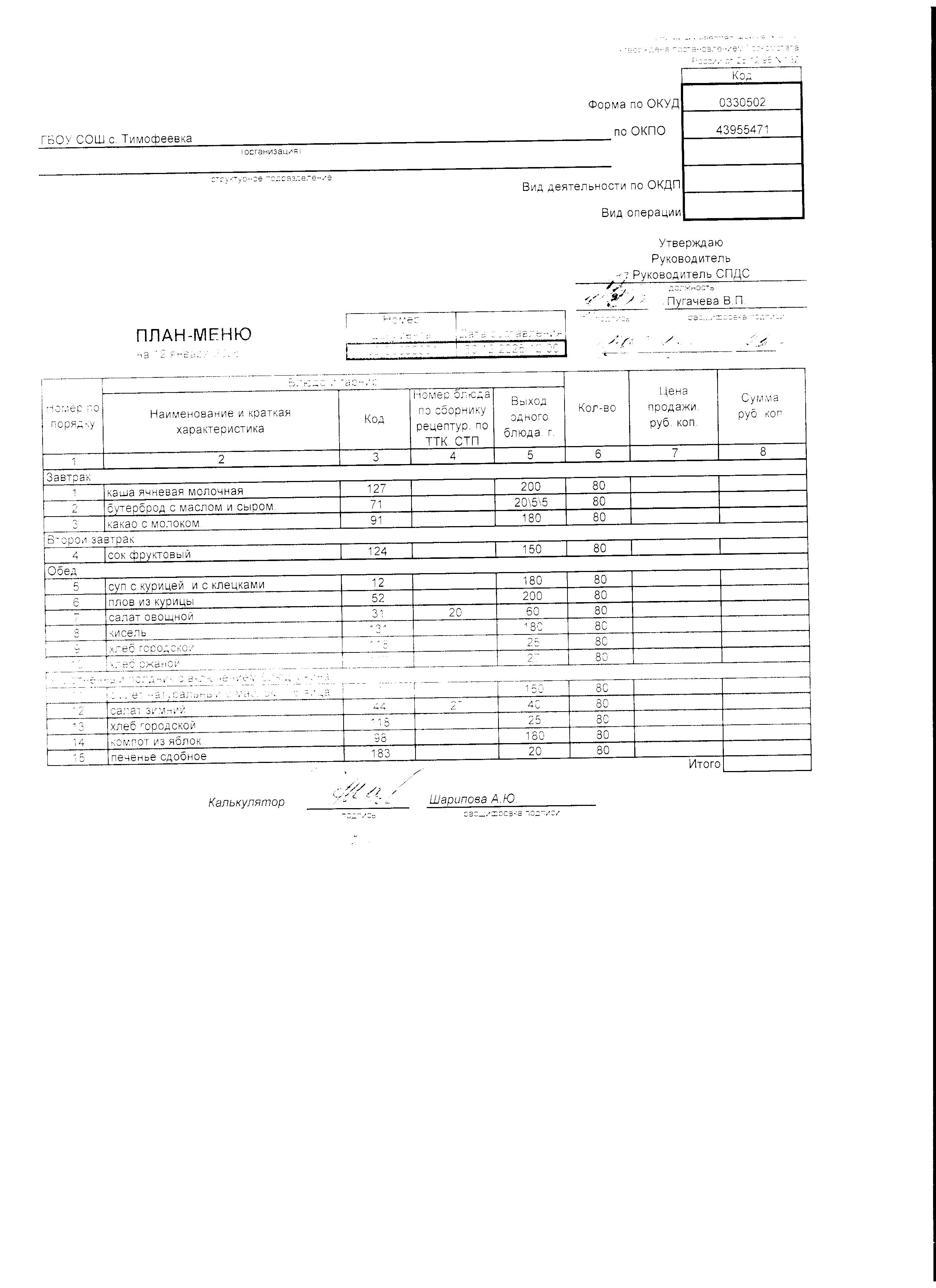 Утвержденное примерное меню (по сезонам в соответствии с возрастной категорией обучающихся)