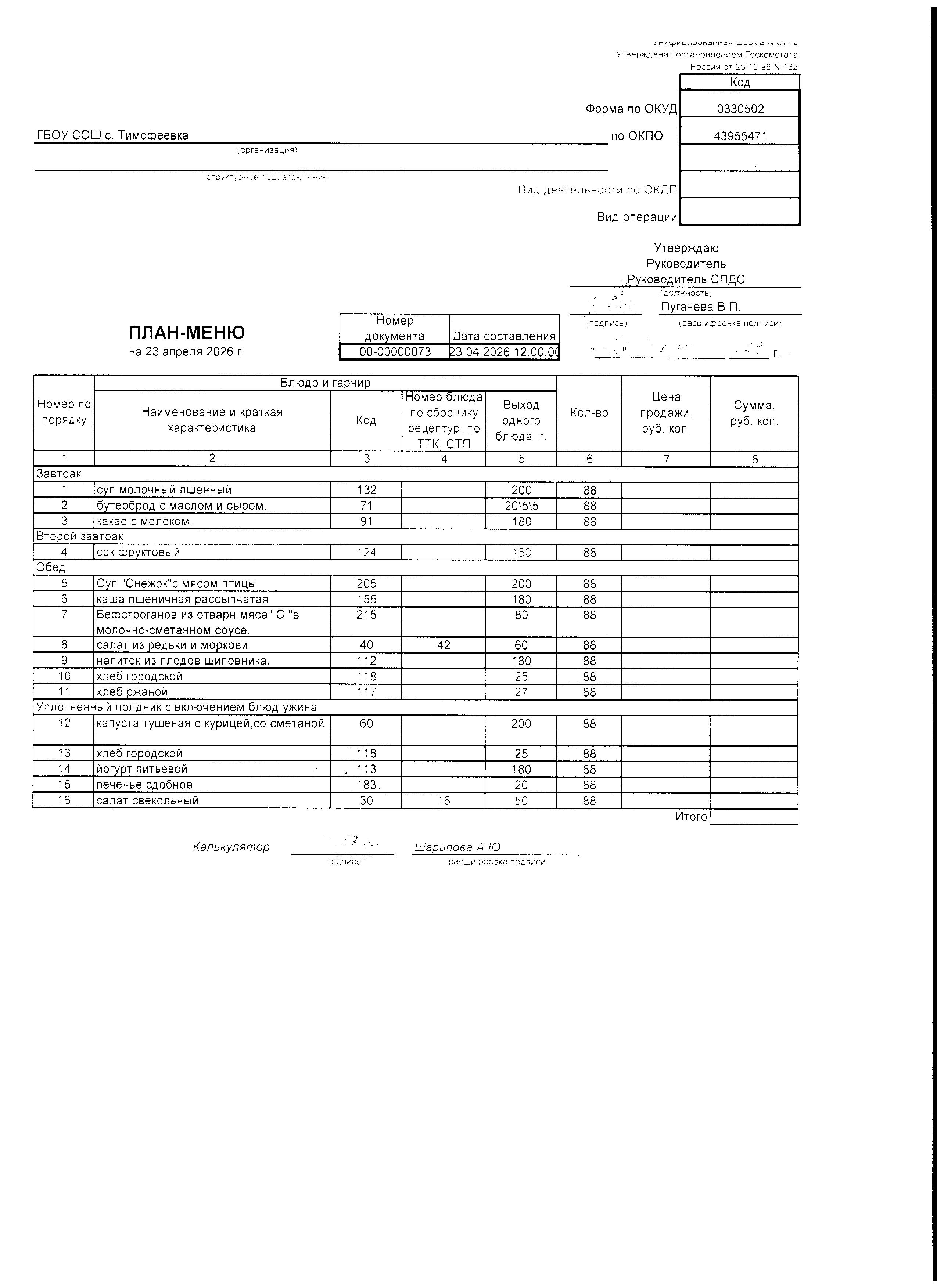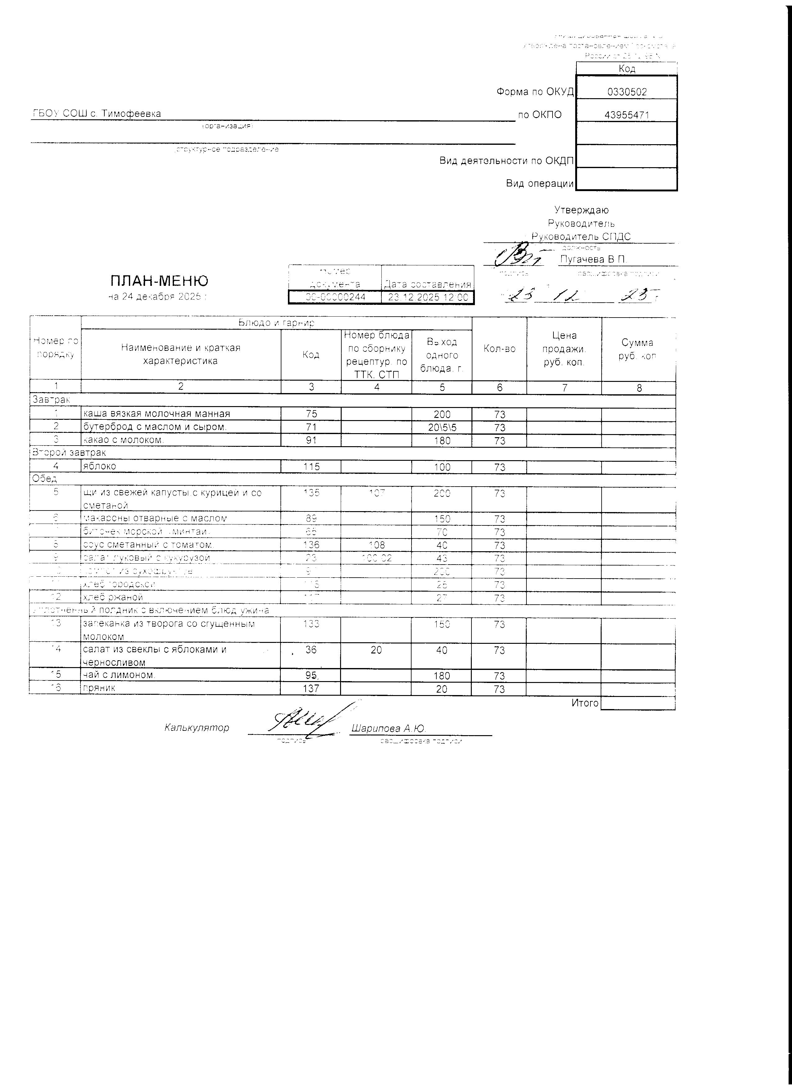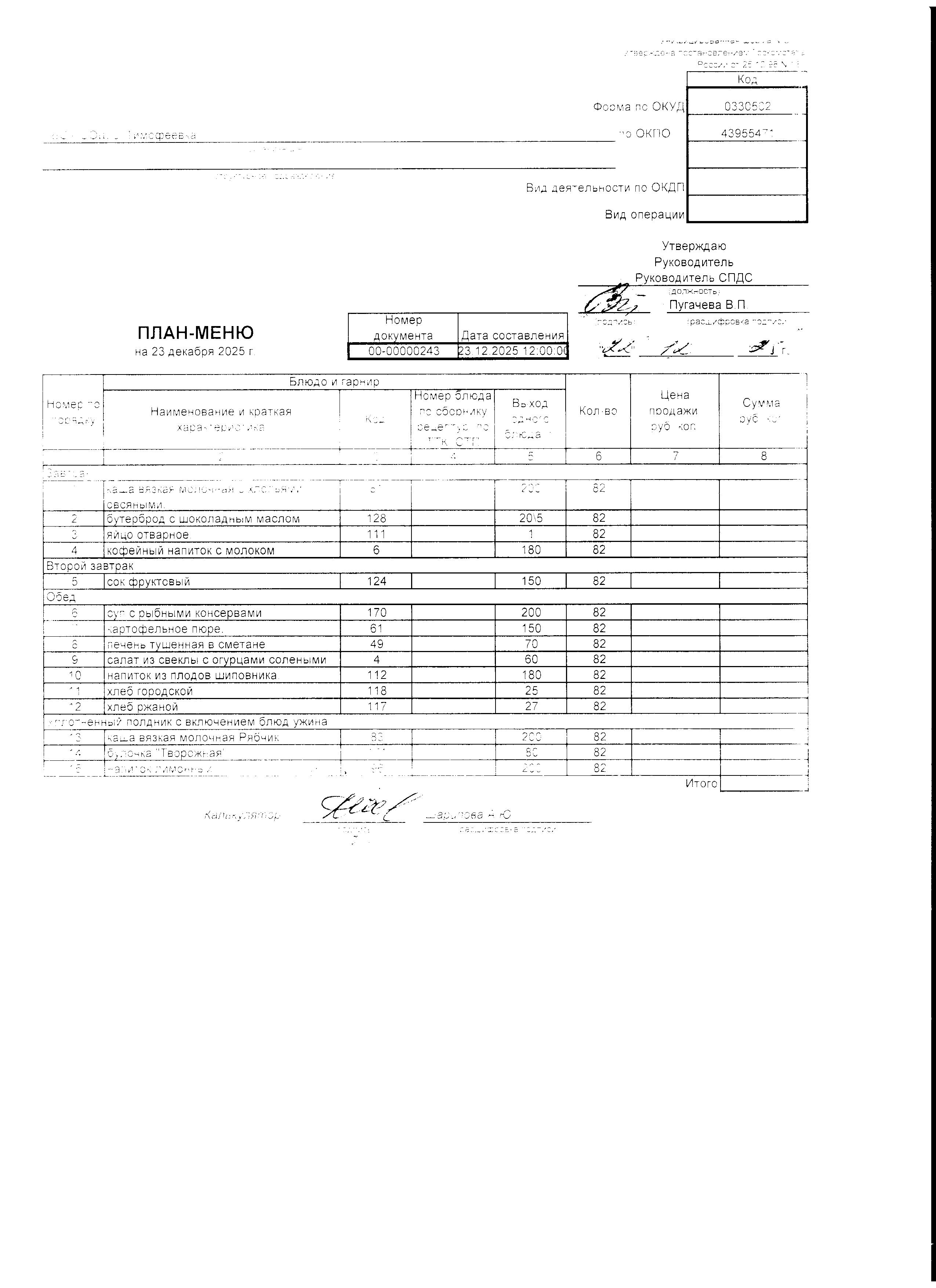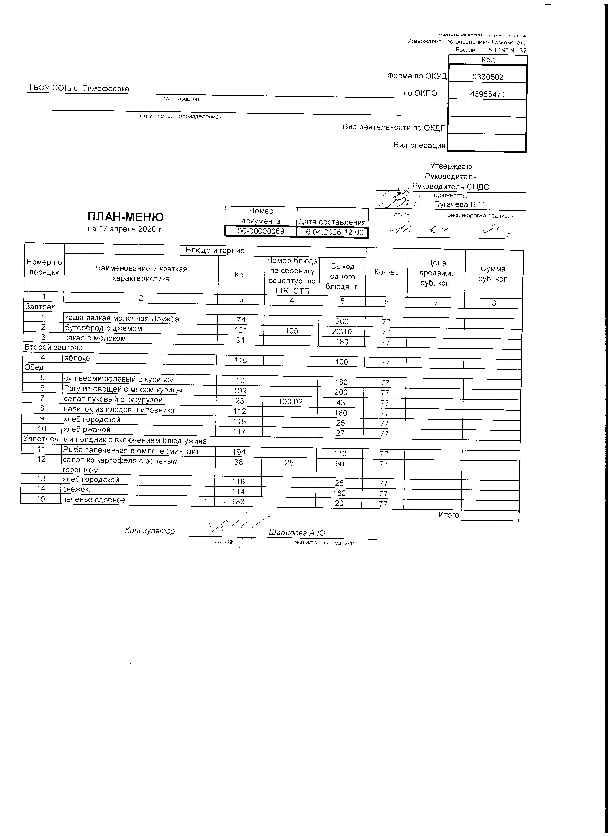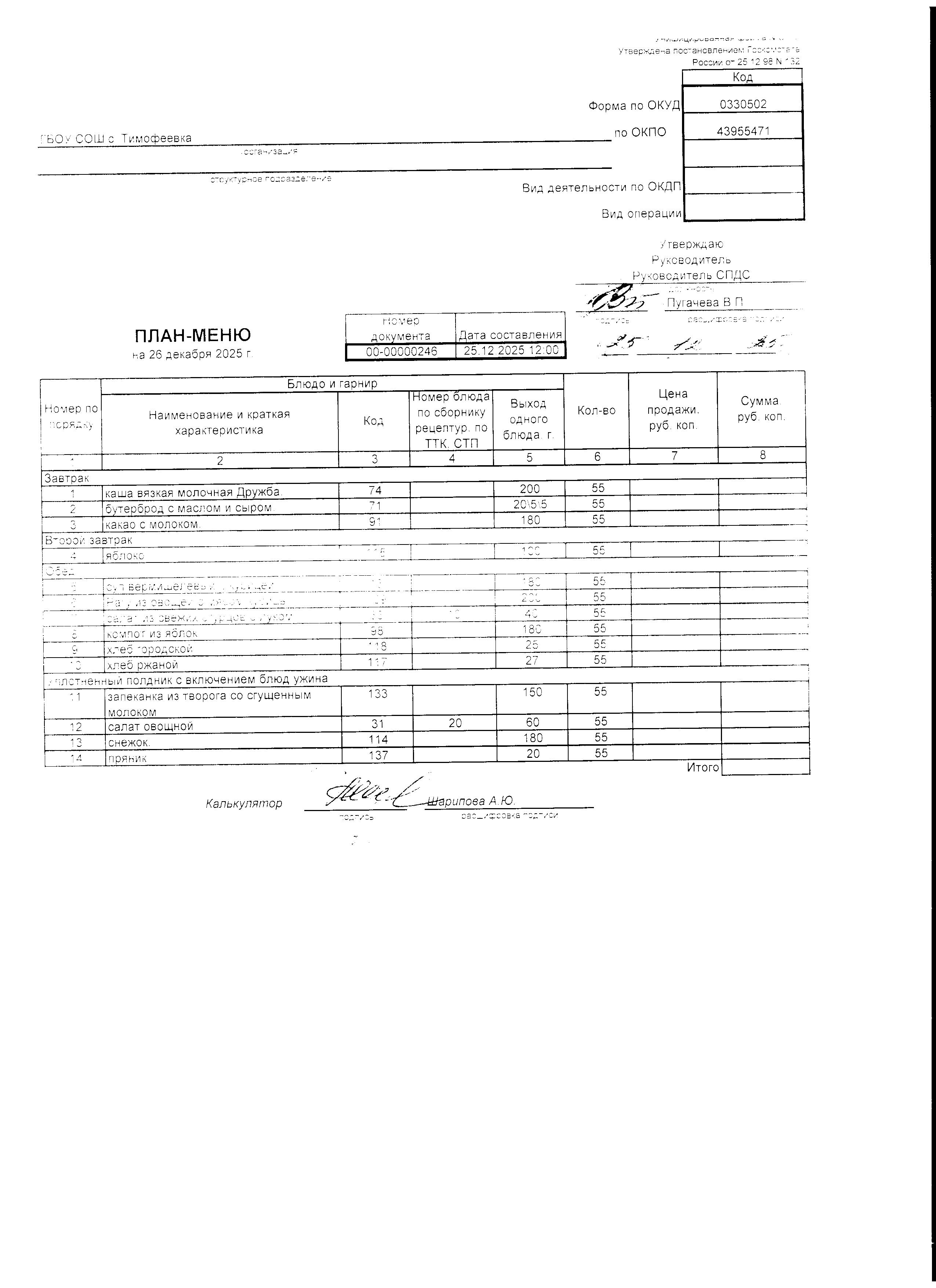 Утвержденное примерное меню (по сезонам в соответствии с возрастной категорией обучающихся)