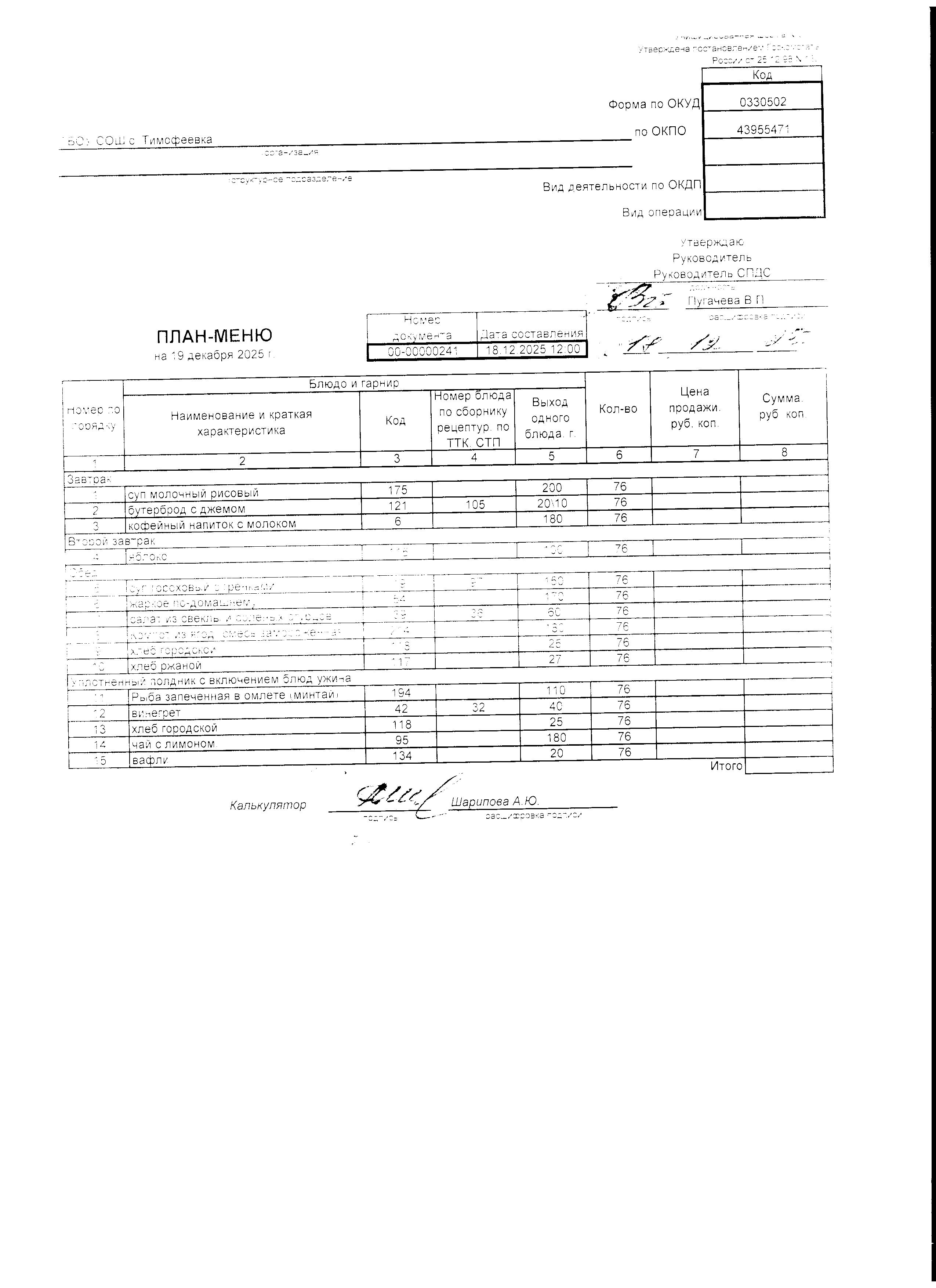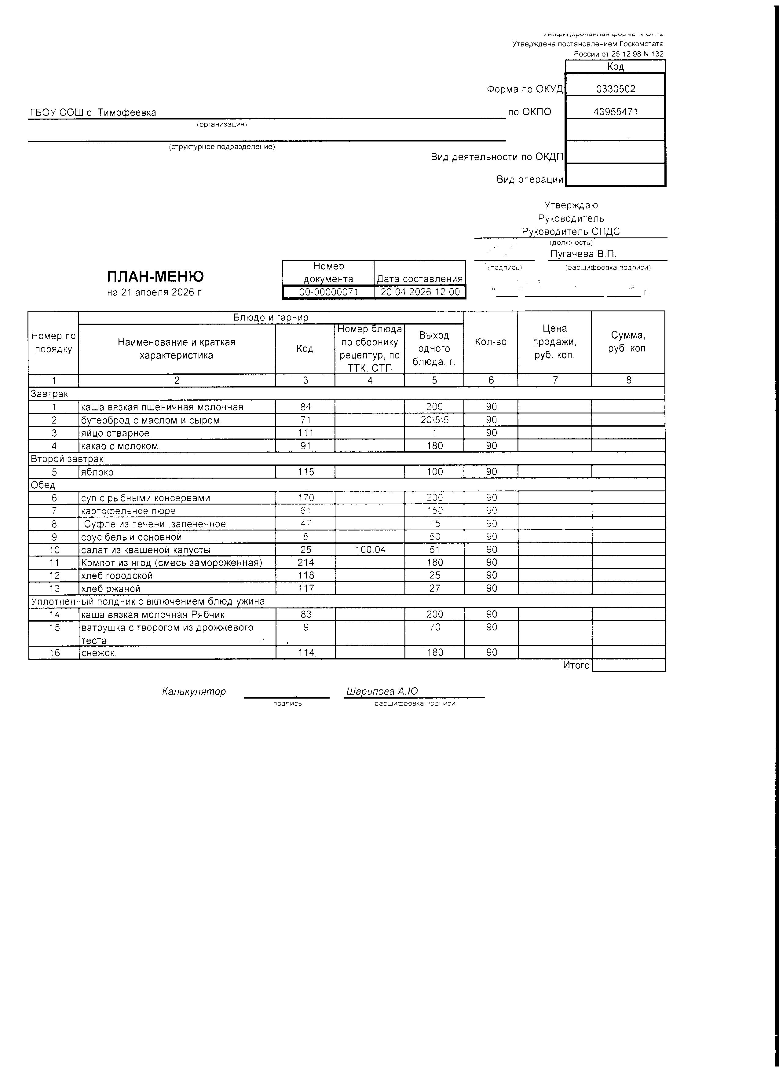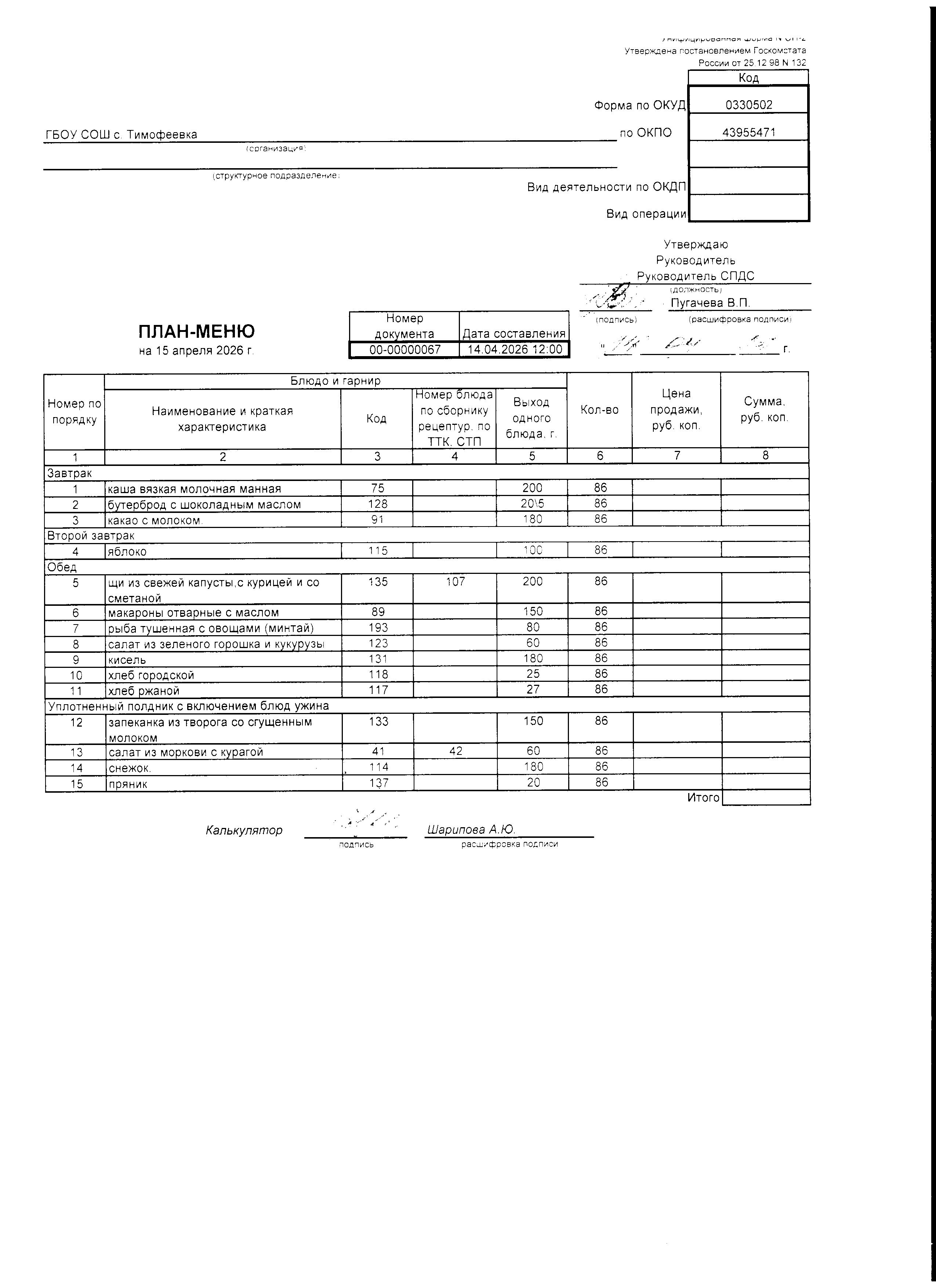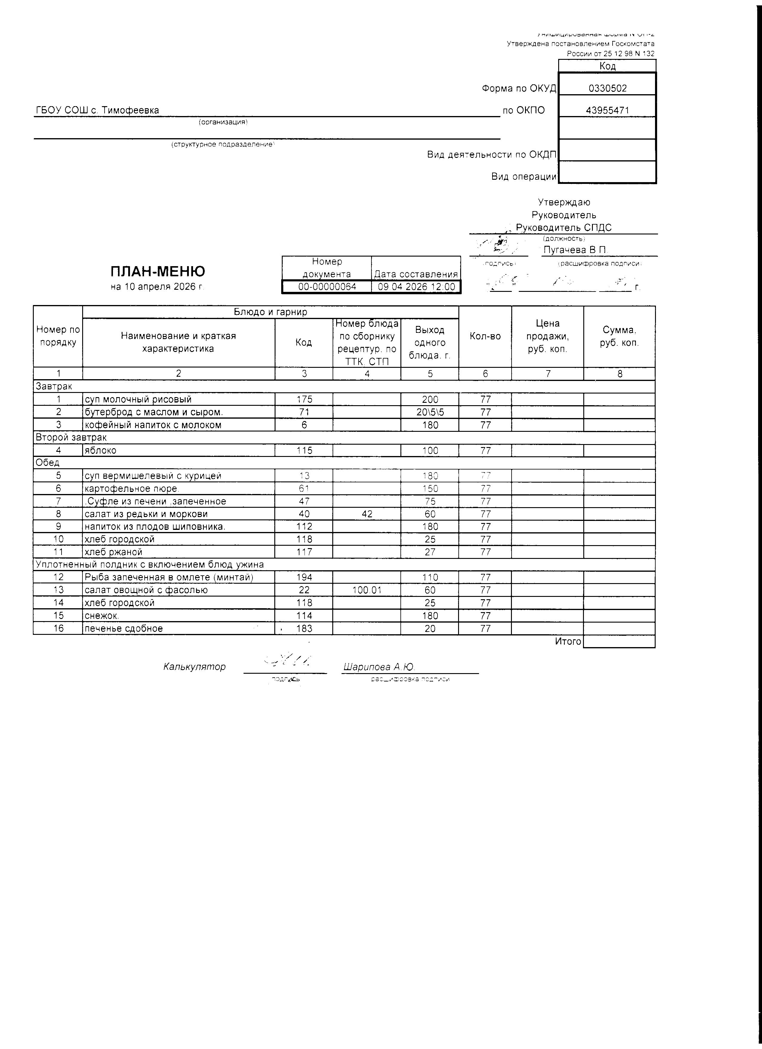 Утвержденное примерное меню (по сезонам в соответствии с возрастной категорией обучающихся)