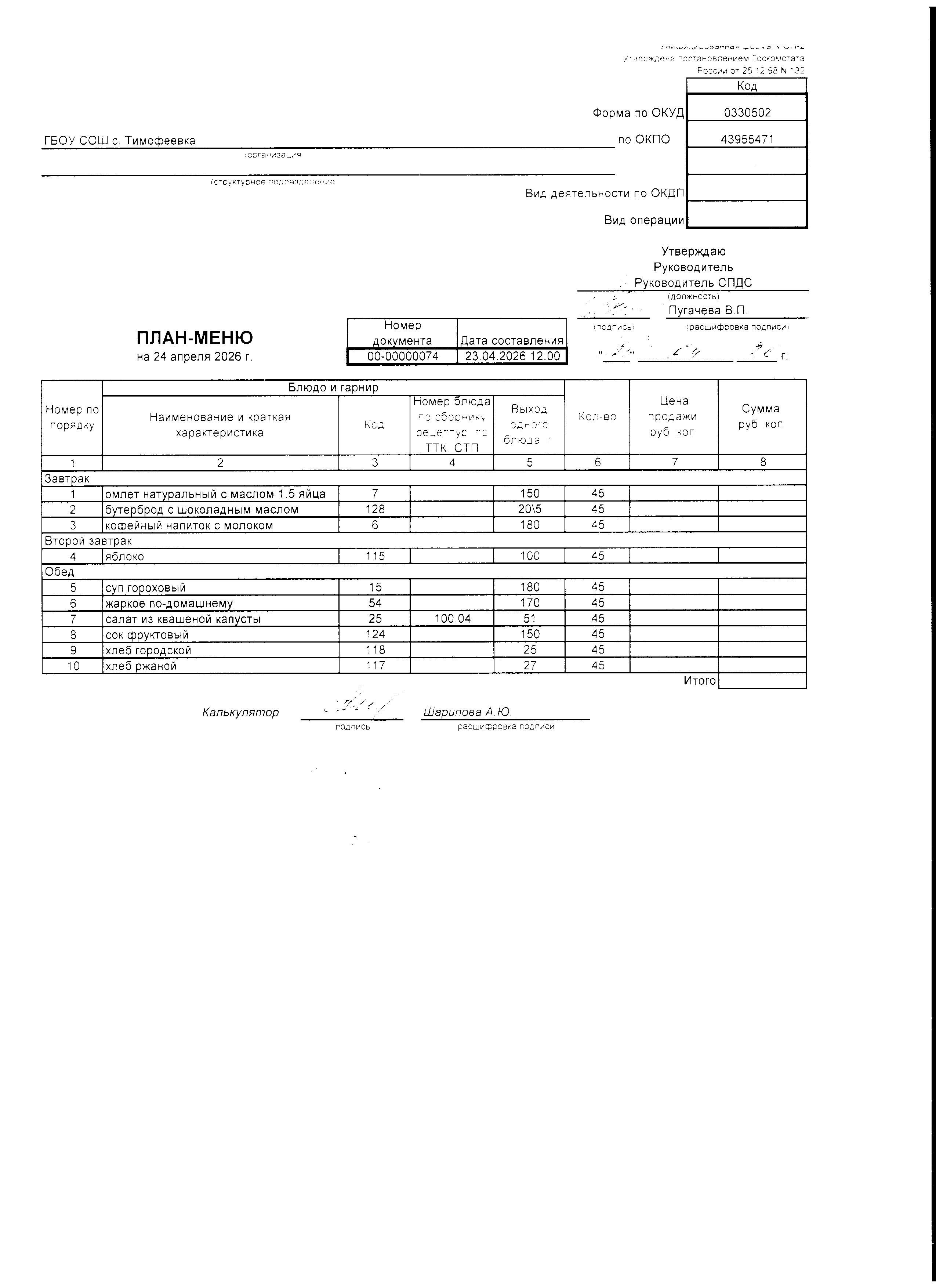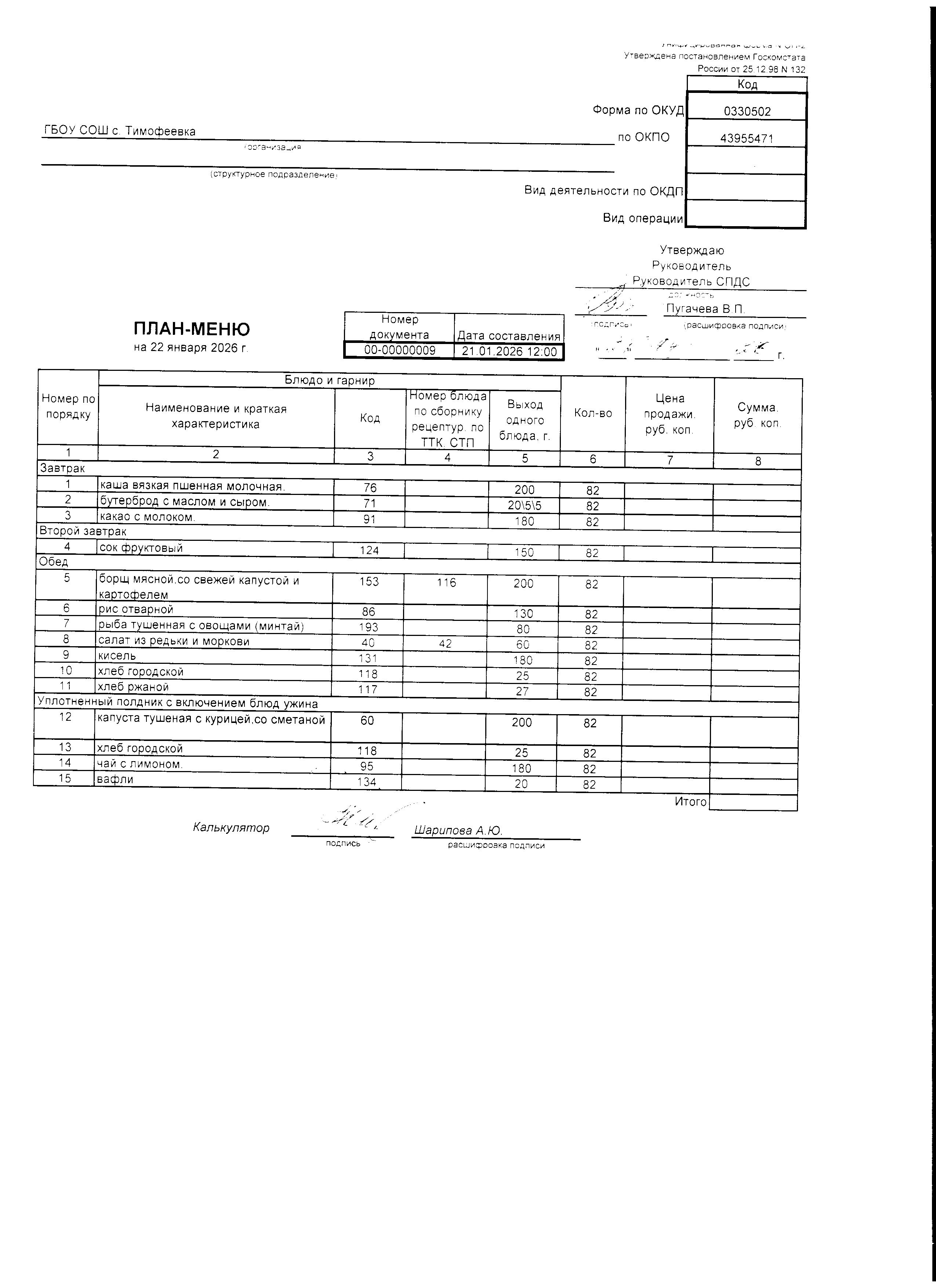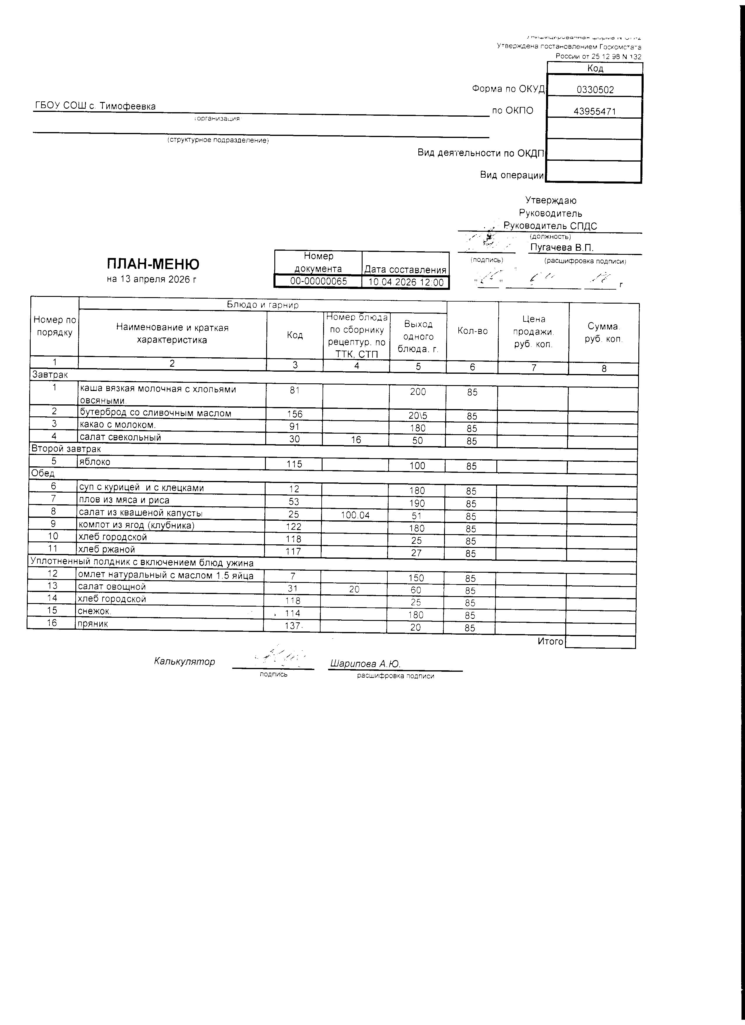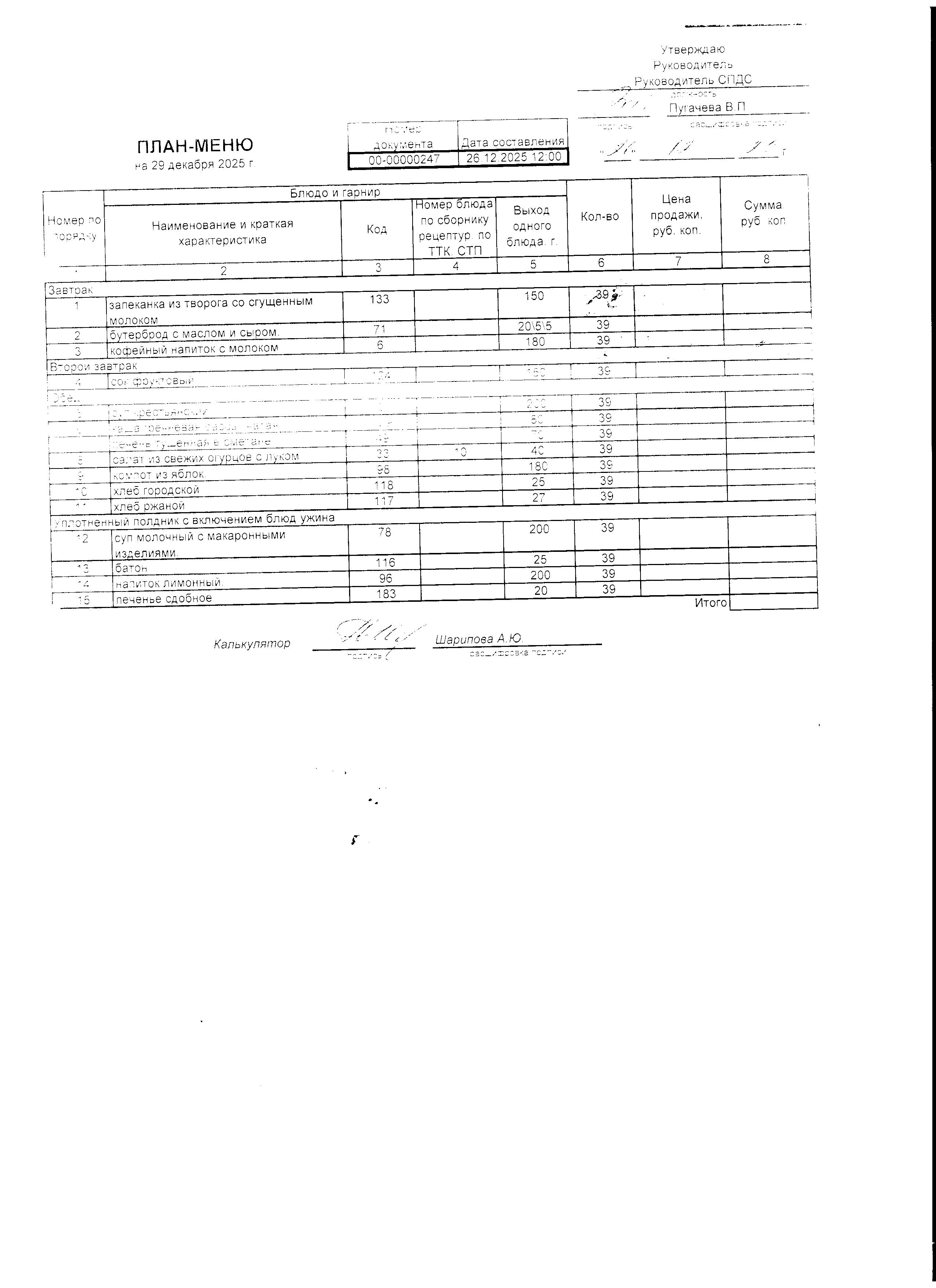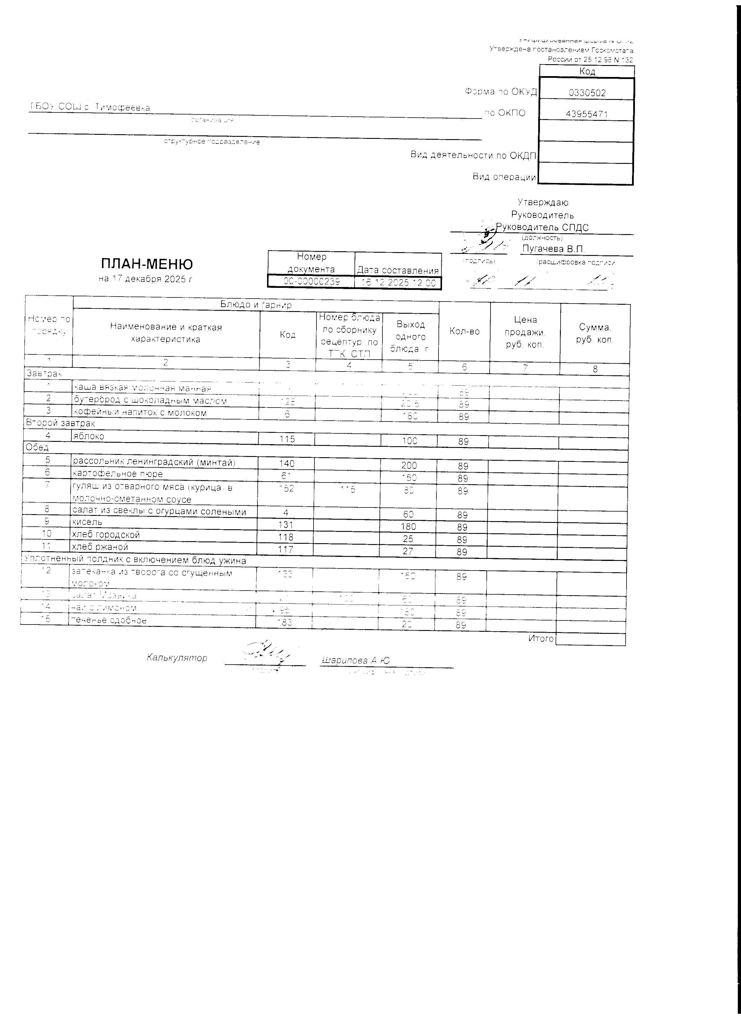 Утвержденное примерное меню (по сезонам в соответствии с возрастной категорией обучающихся)