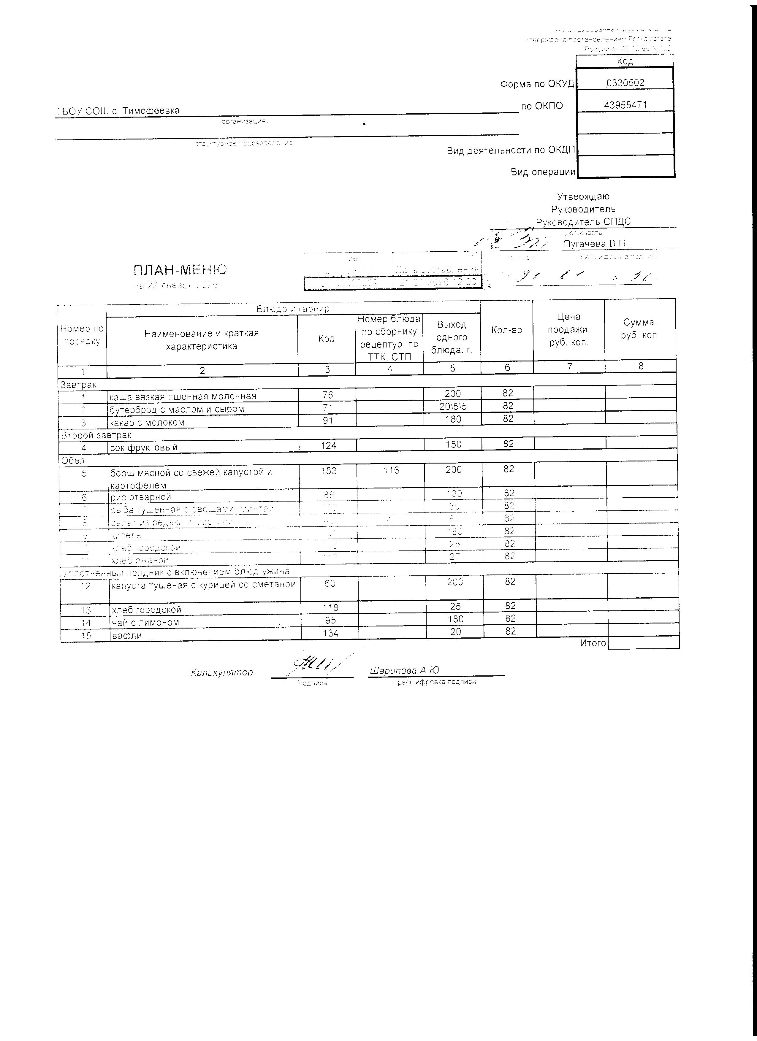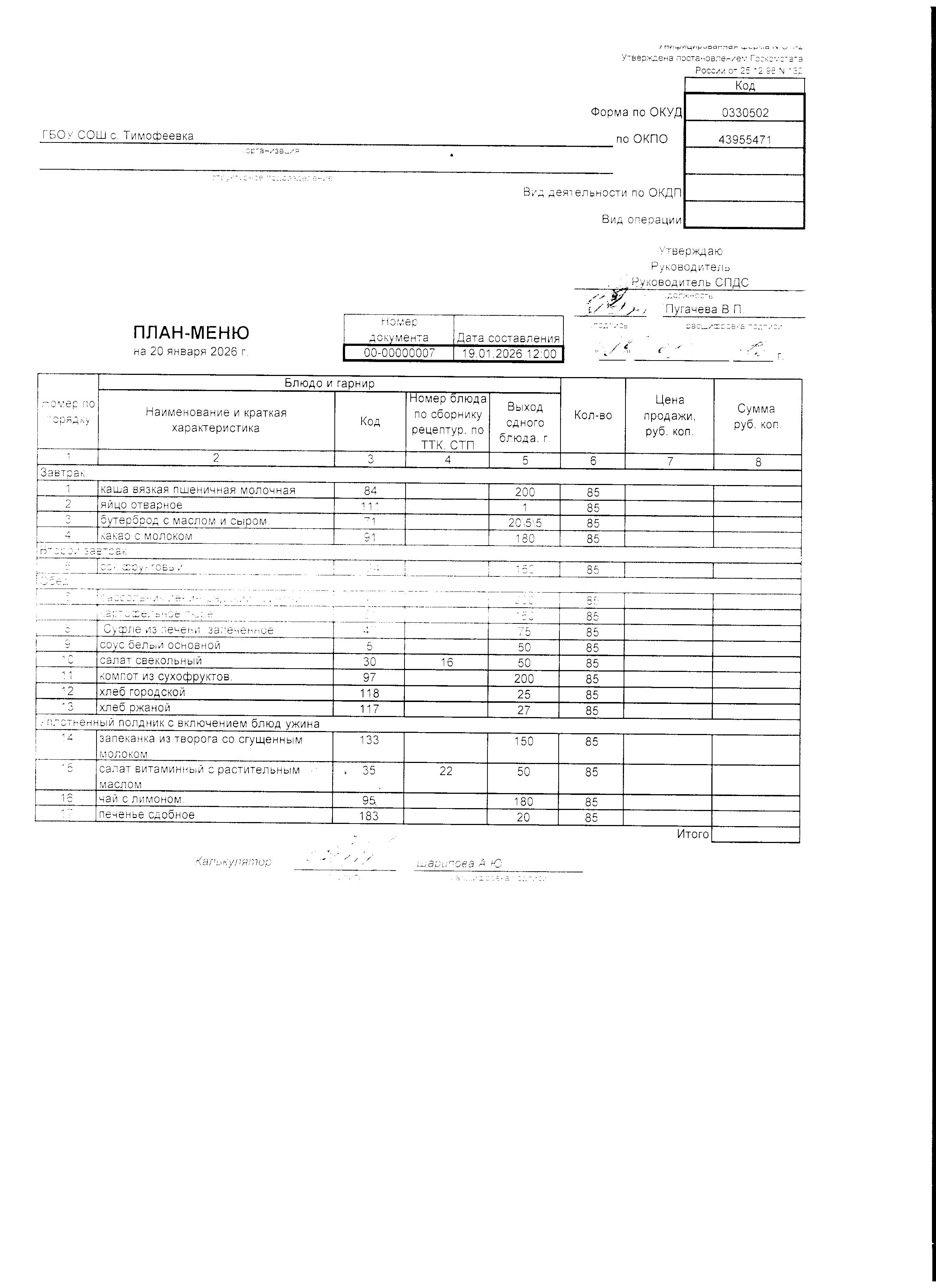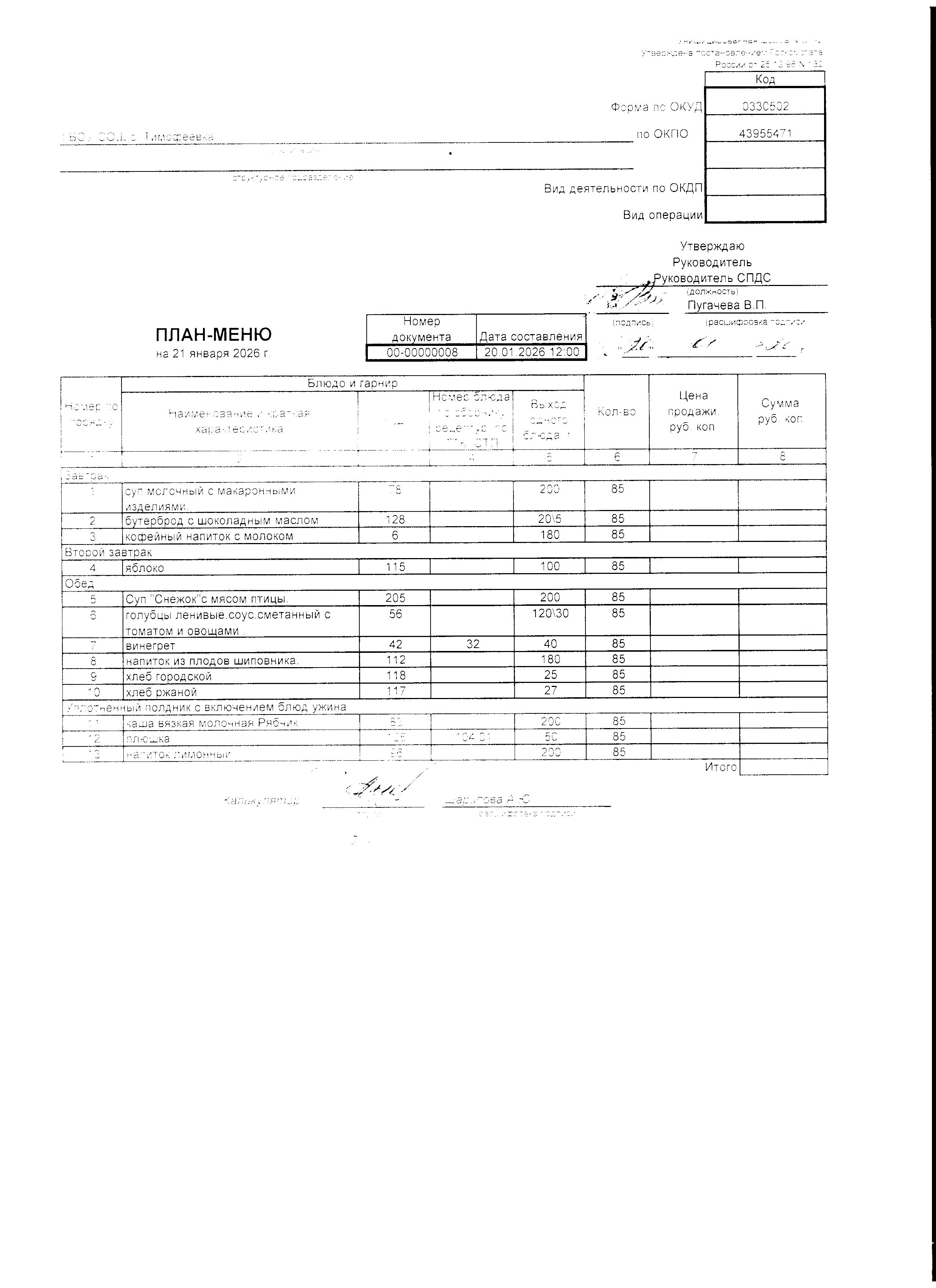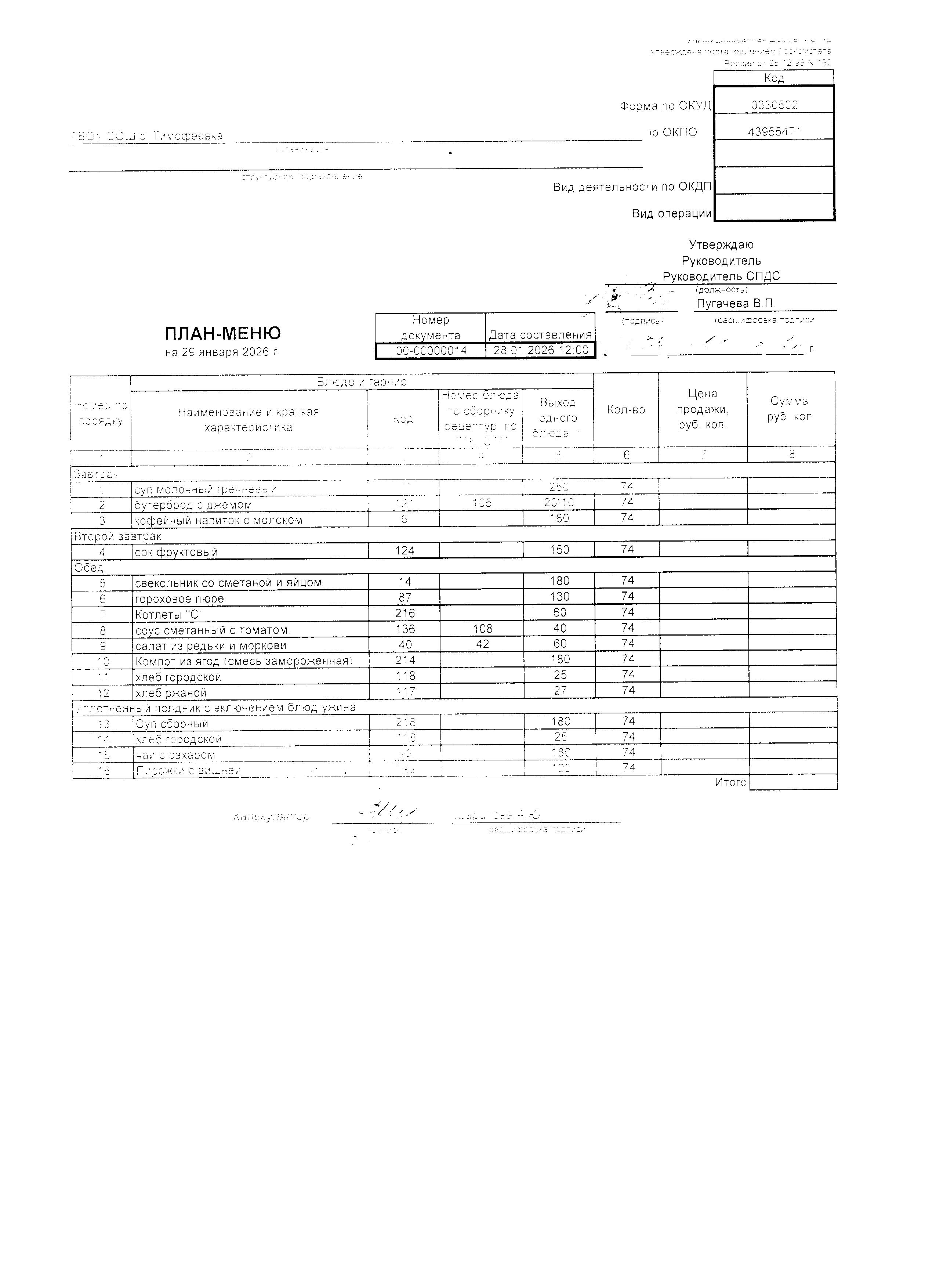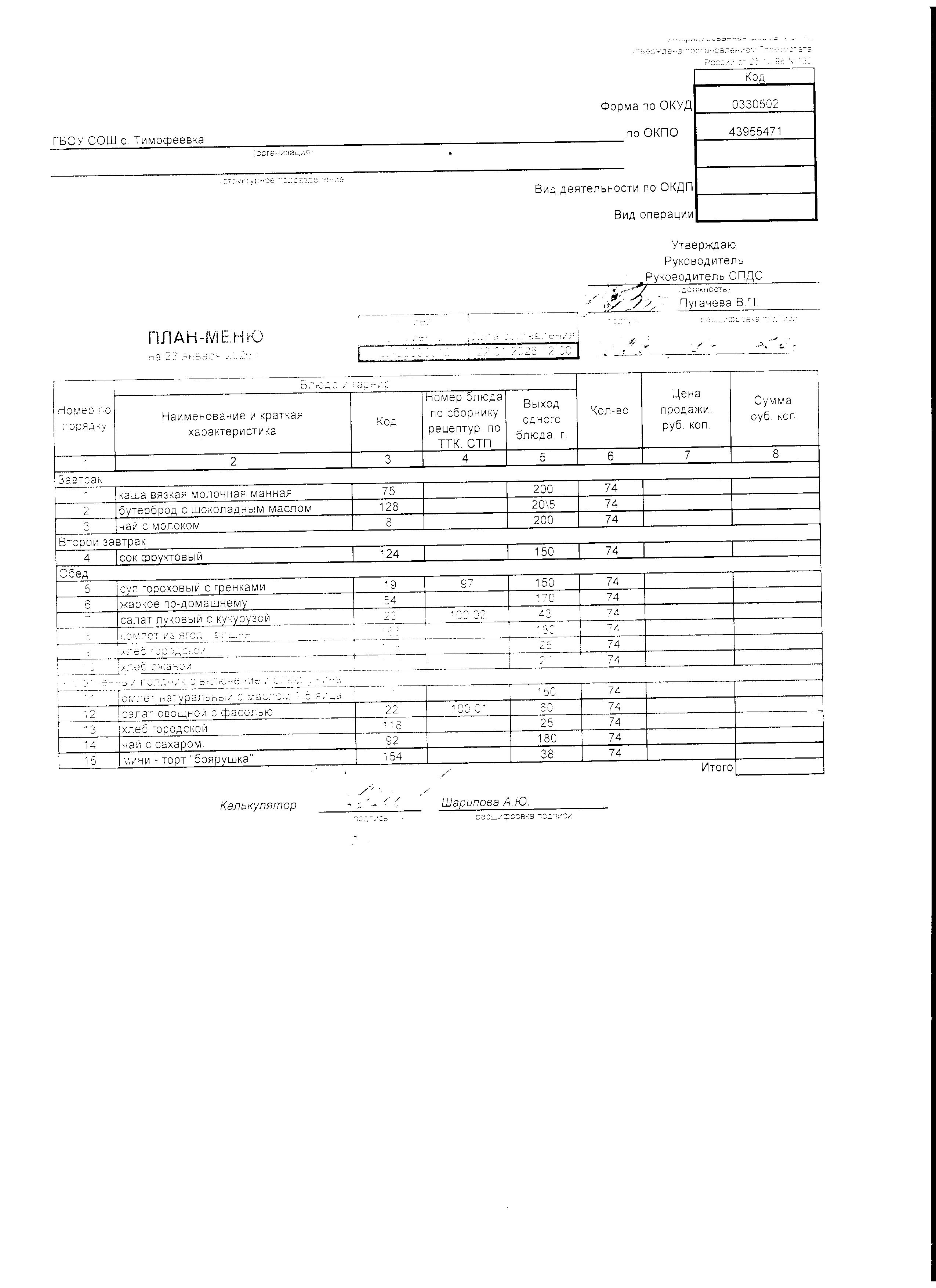 Утвержденное примерное меню