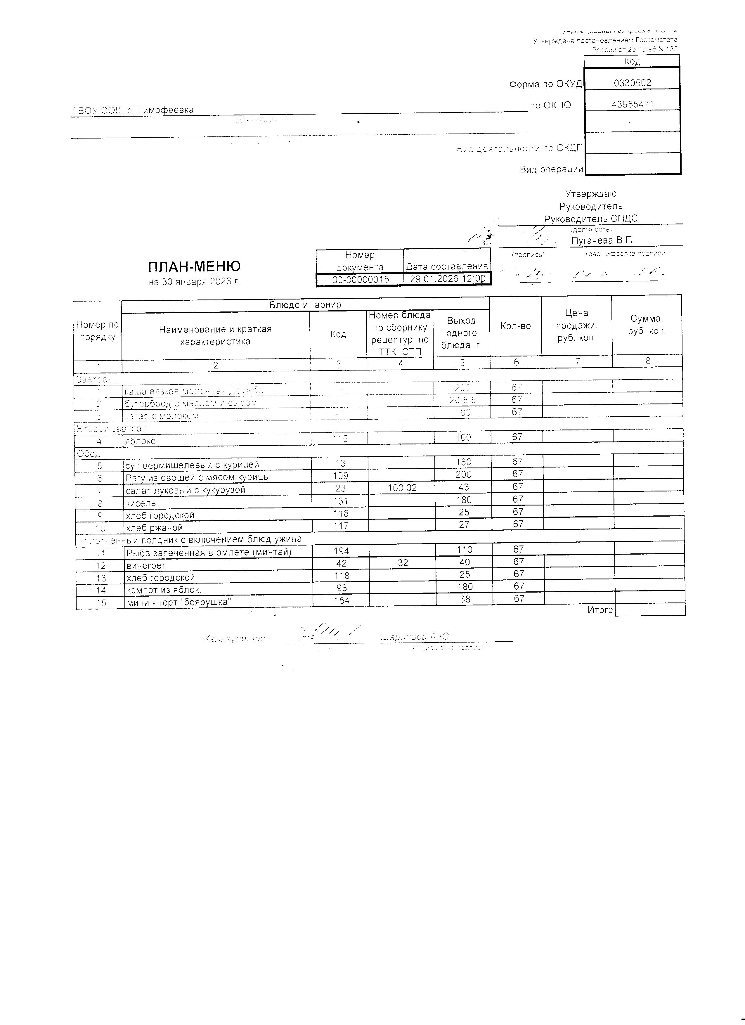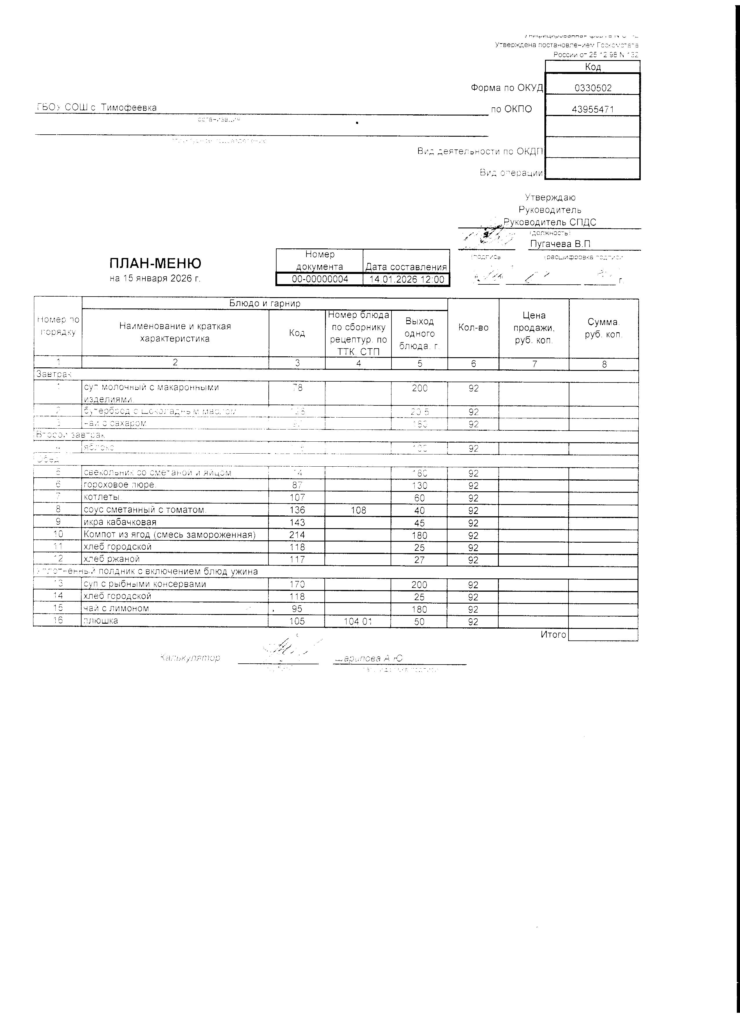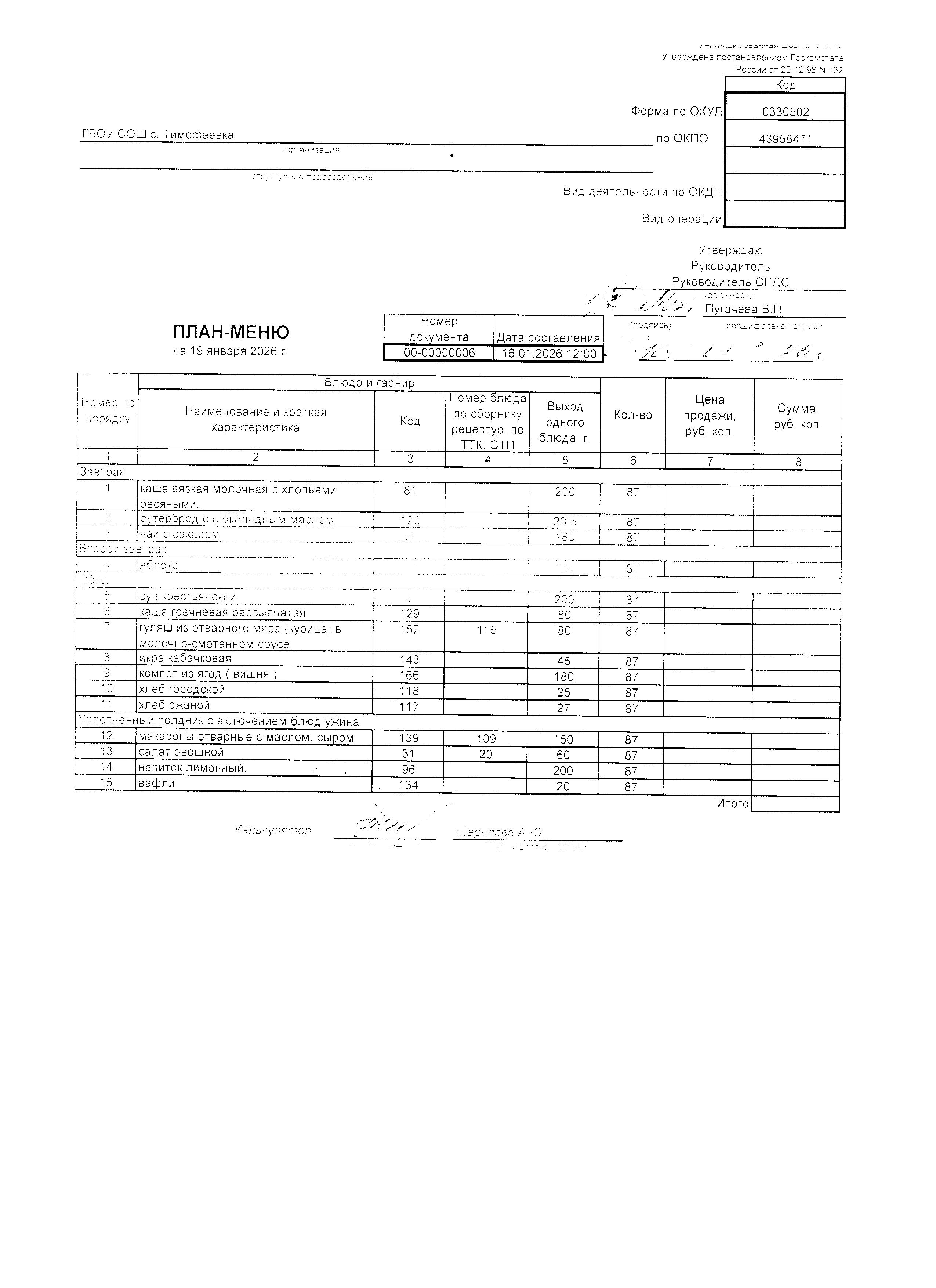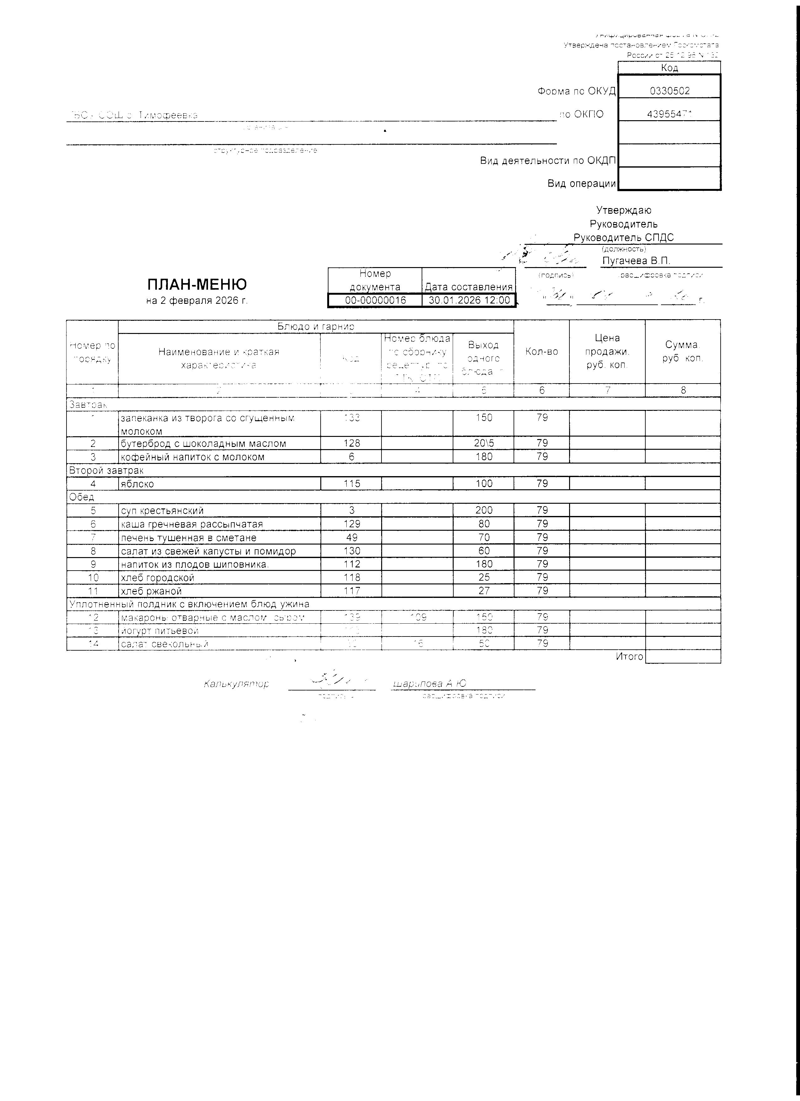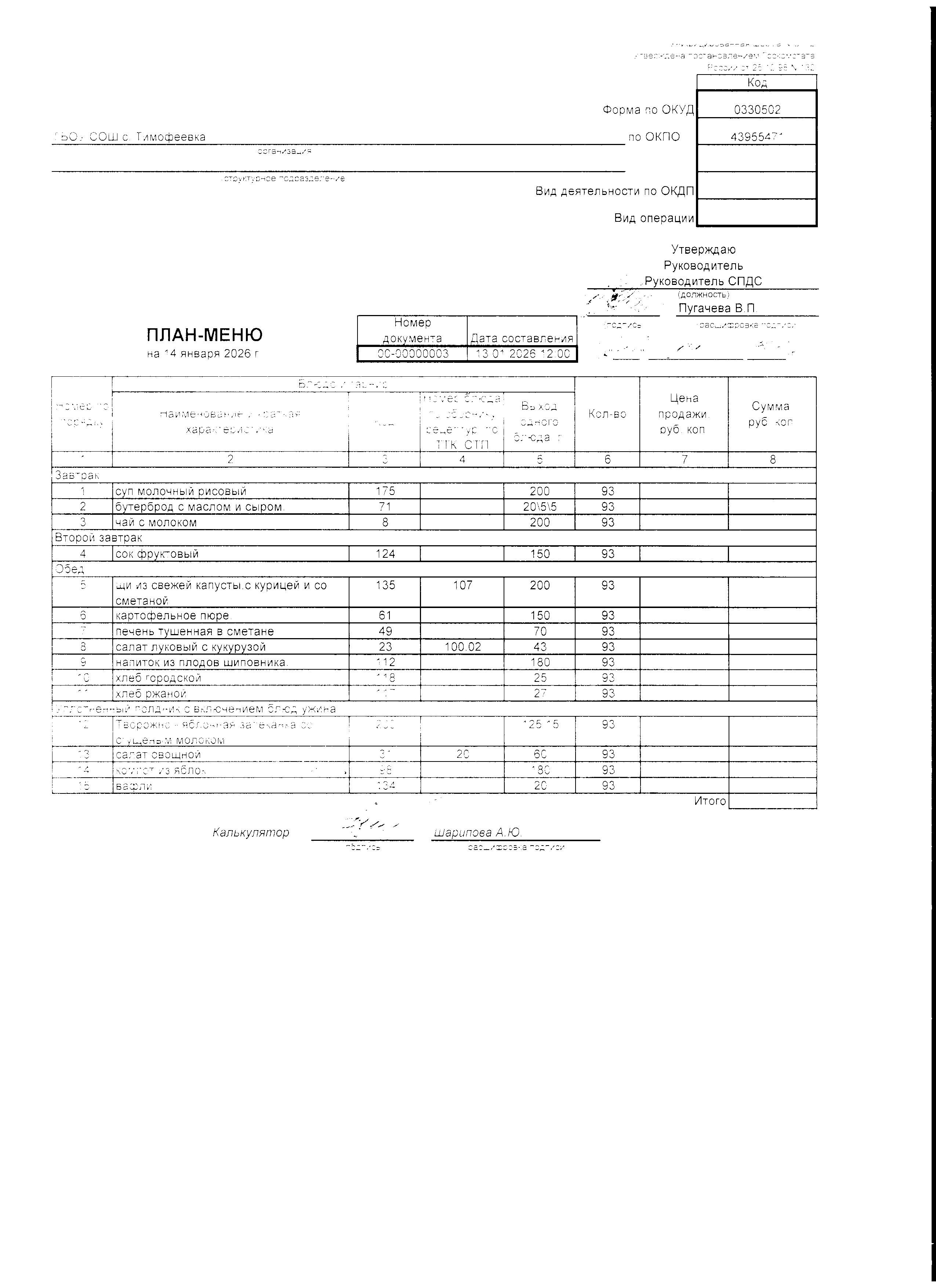 Утвержденное примерное меню